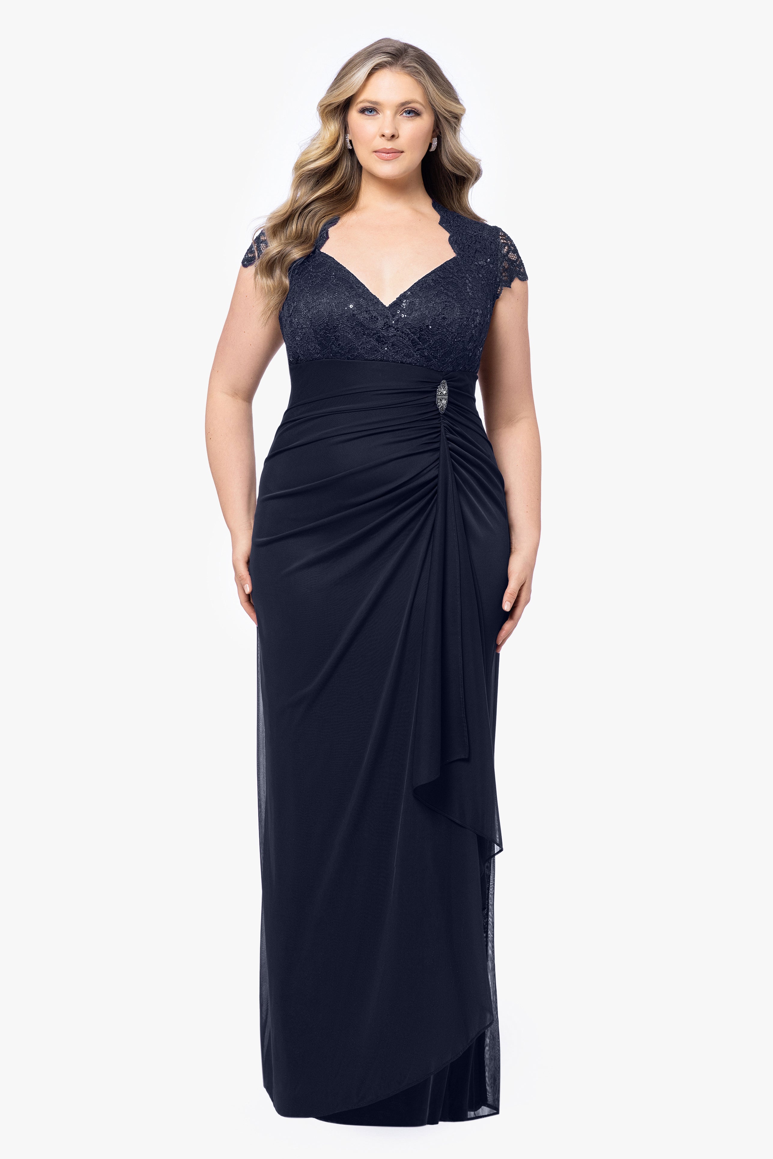 Plus "Kim" Sheer Matte Jersey Lace Cap Sleeve Dress