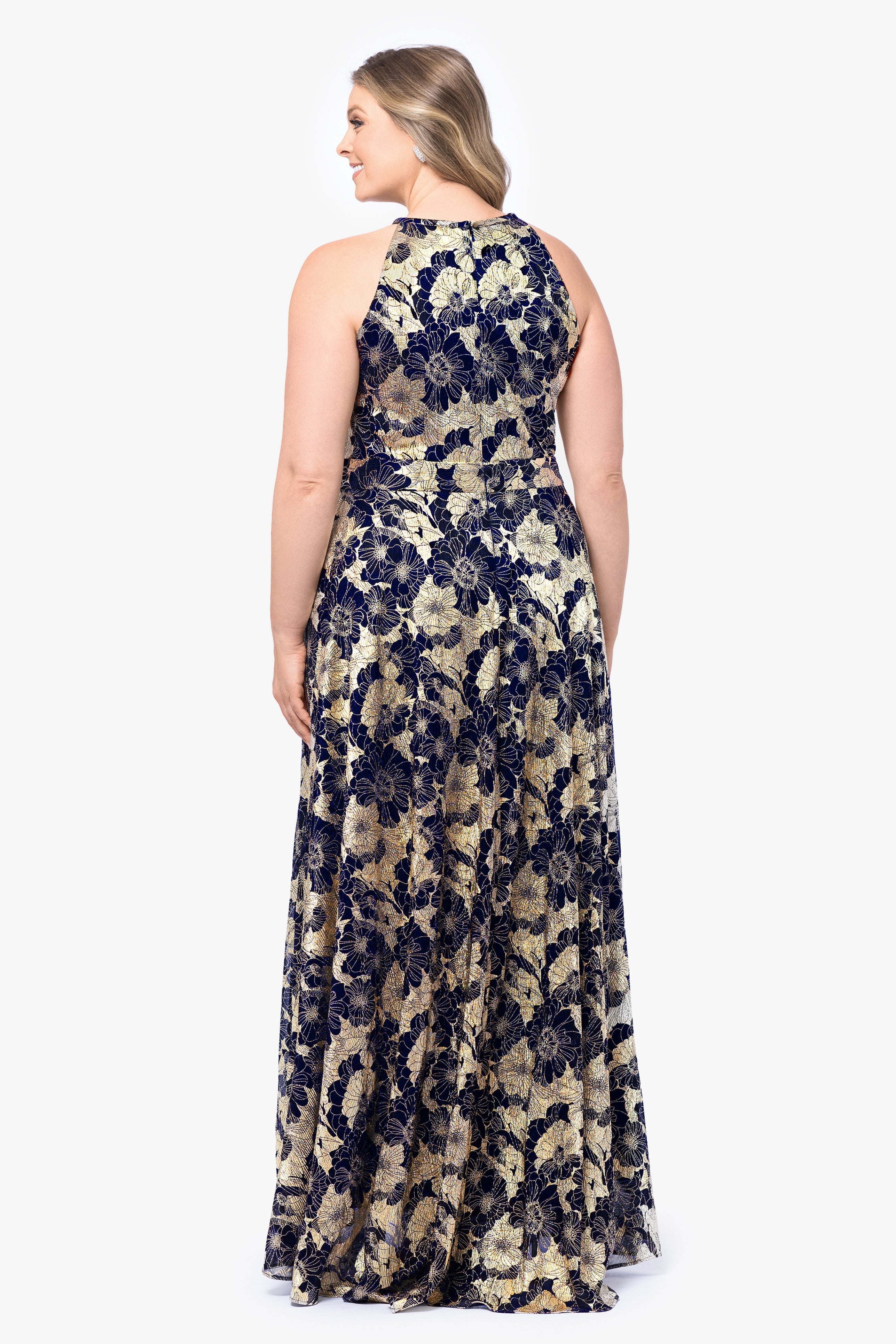 Plus "Layla" Long Halter Top Wrap Foil Print Dress