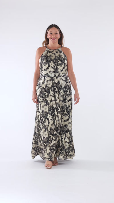 Plus "Layla" Long Halter Top Wrap Foil Print Dress