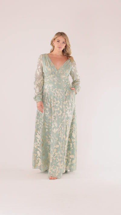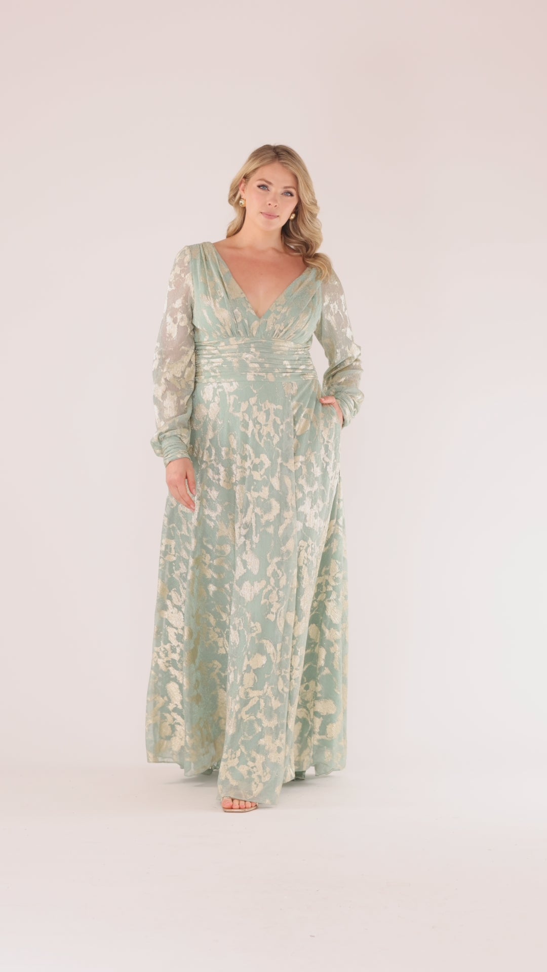 Plus "Melanie" Foil Knit V-Neck Long Sleeve Floor Length Dress