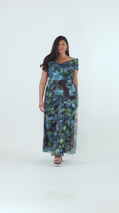 Plus "Tiffany" Organza Printed Off The Shoulder Floor Length Dress