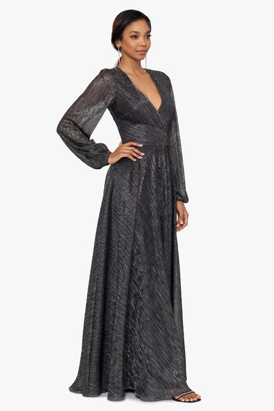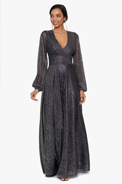 "Reign" Long Sleeve V Neck Metallic Knit Wrap Dress