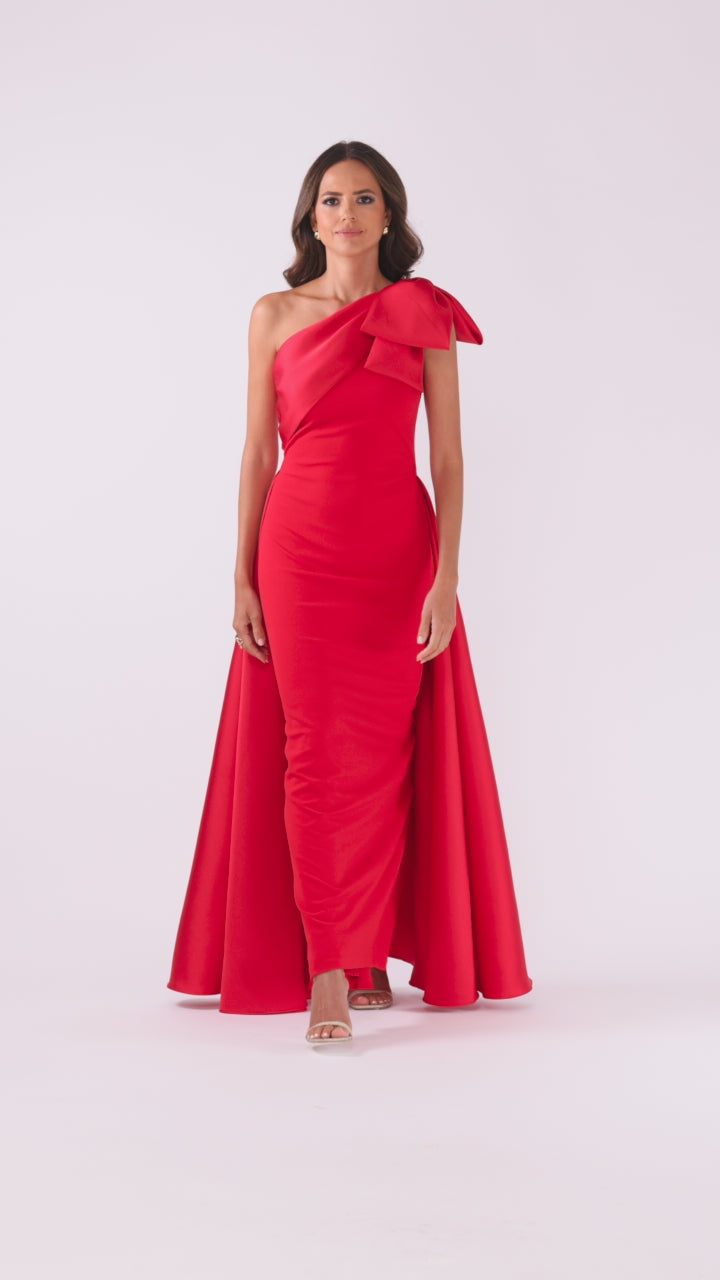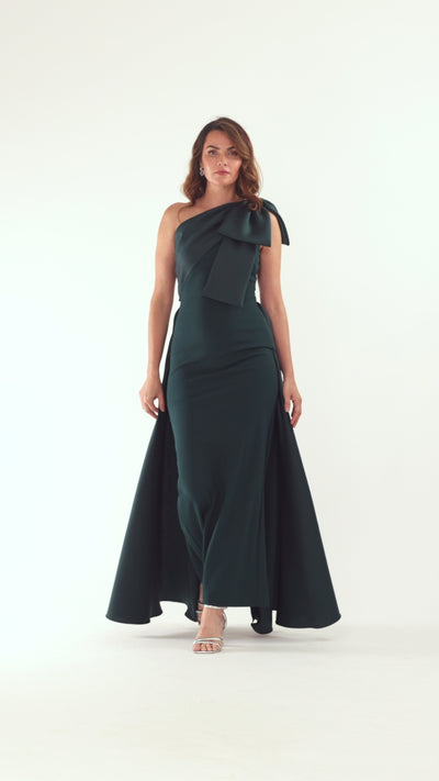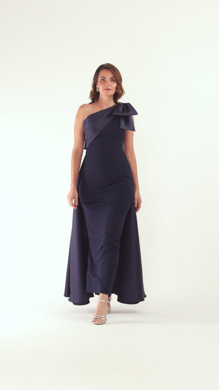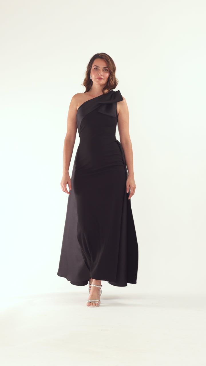 This floor-length gown features a refined one-shoulder design enhanced by an elegant bow embellishment. Crafted from smooth scuba crepe fabric, it offers a flattering silhouette with a graceful drape that moves effortlessly. Perfect for formal occasions, the dress combines modern structure with timeless sophistication.