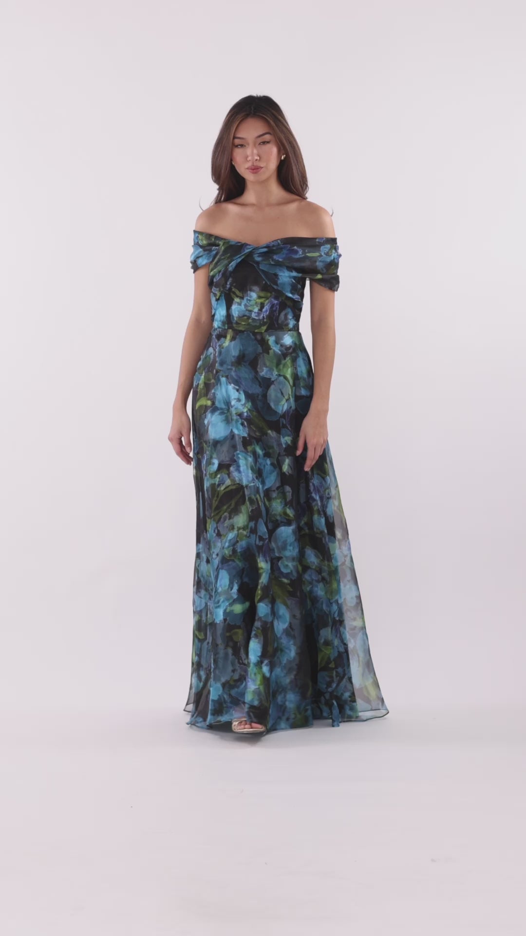 This stunning off-the-shoulder gown features a rich teal and blue floral print set against a dark backdrop for dramatic elegance. The softly draped neckline enhances the shoulders, while the fitted bodice flows into a full, airy skirt that moves beautifully with every step. Perfect for formal evenings and special occasions.