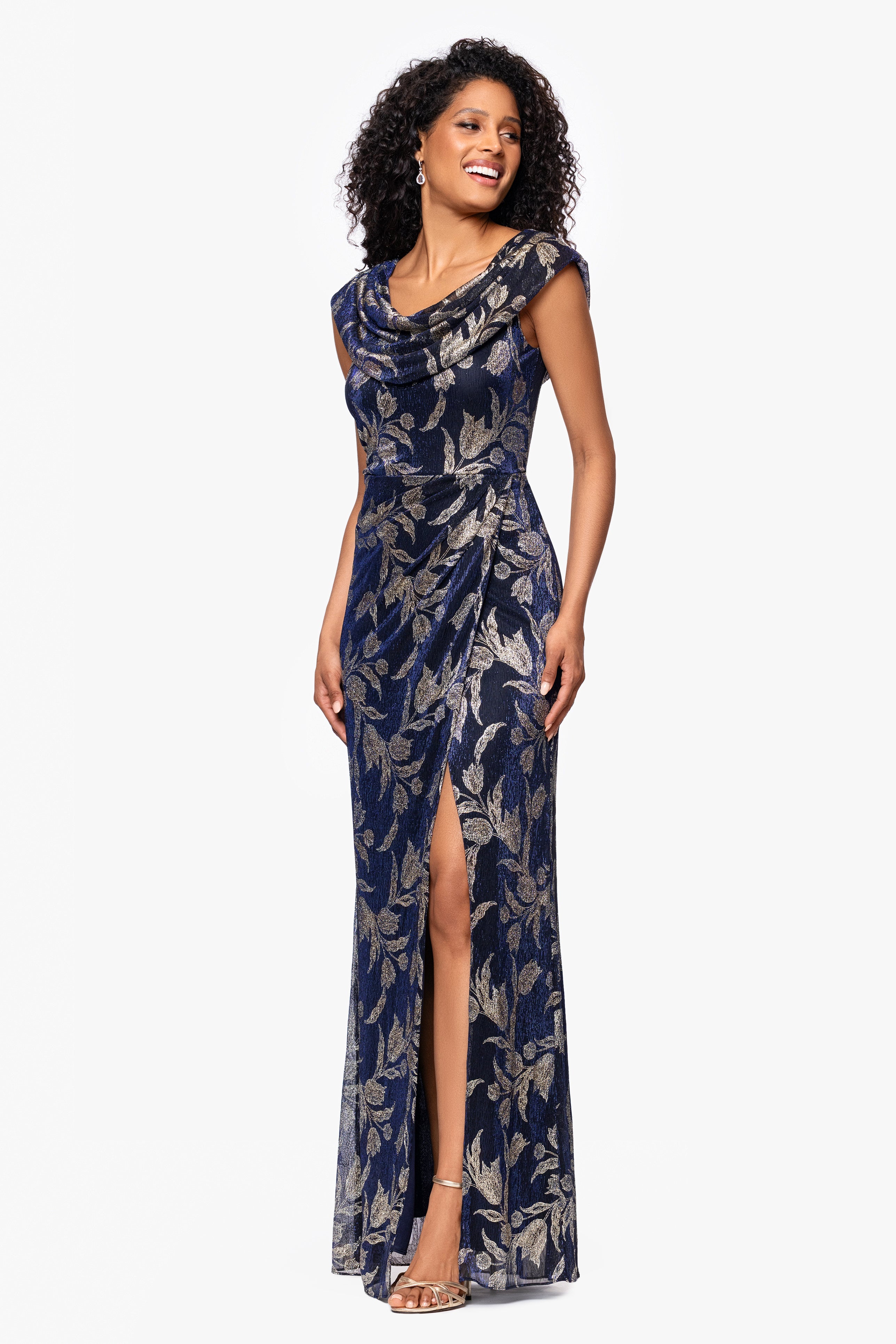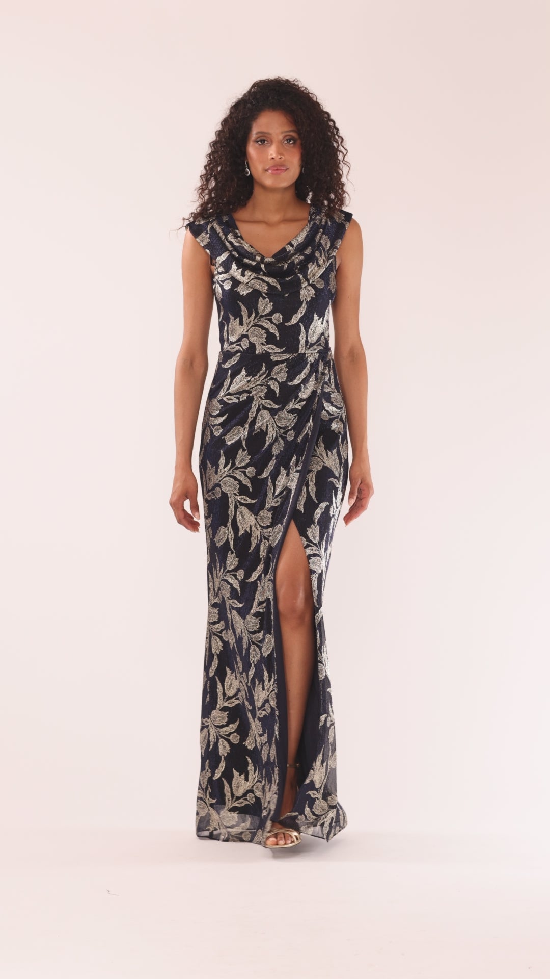 A stunning choice for any formal affair, this gown features a softly draped neckline and shimmering floral motif throughout. The side slit adds a modern edge to its classic elegance, making it a perfect pick for weddings, galas, and special celebrations.